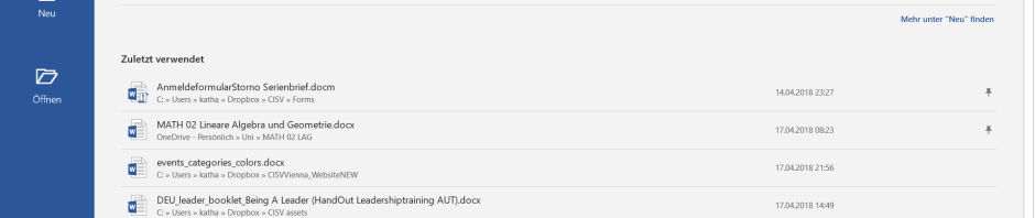 Es ist nicht wild – der linke Bereich ist ein bisschen „aufgeräumter“ – Sie können mit dem Häuschen immer wieder hierher zurück kommen, sehen den Button für das Anlegen eines neuen Dokuments, und den für das Öffnen bestehender Dokumente (dort sieht es dann fast so aus wie immer – ich zeig Ihnen das morgen). Im Hauptbereich finden Sie oben die Vorlagen, die Ihnen gerade empfohlen werden, und darunter die zuletzt verwendeten bzw. von Ihnen angehefteten Dateien.