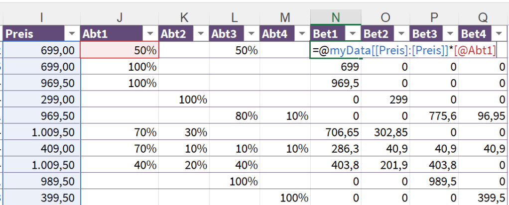 Den klassischen gemischten Bezug (Spalte, Zeile variabel), den wir hier brauchen, erzeugst du (mühsam!) mit @tabellenname[[Spalte]:[Spalte]]. Du siehst es hier im Bild – die Preis-Spalte bleibt für alle Formeln gleich, die Abt1-Spalte wird beim AutoAusfüllen zu Abt2, …