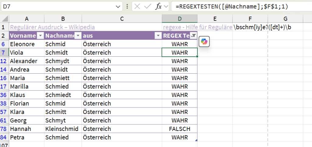 Das führt uns jetzt zu weit – heute wende ich mich explizit an die Spezialist:innen, die damit was anfangen können – alle anderen: bitte hier entlang https://de.wikipedia.org/wiki/Regul%C3%A4rer_Ausdruck für Details, und dann hier https://regexe.de/ für erste Selbstversuche. Vielleicht ganz kurz noch als Appetizer: damit kann man Muster definieren, die eine Zeichenkette aufweisen soll, oder eben nicht, und dann Texte prüfen, ob sie zu diesem Muster passen. Anwendung also: „Ist das eine gültige Mailadresse?“, „Ist das eine brauchbare Telefonnummer“, oder auch, und das zeig ich heute her: „Ist dieser Nachname eine Variation von SCHMIED?“