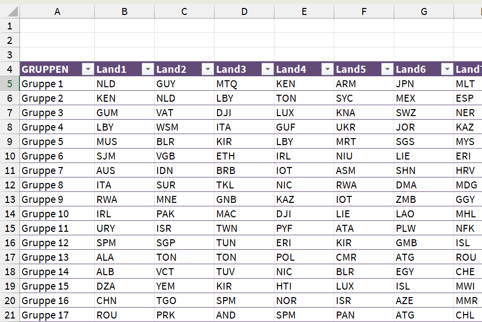 Wie soll ich mir aus so etwas zum Beispiel eine Liste aller Gruppen machen, in denen AUT, GER, NOR oder Kombinationen daraus vorkommen?