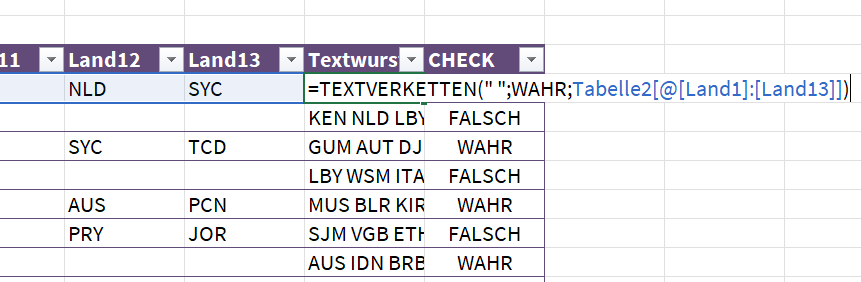 =TEXTVERKETTEN(“ „;WAHR;Tabelle2[@[Land1]:[Land13]])