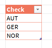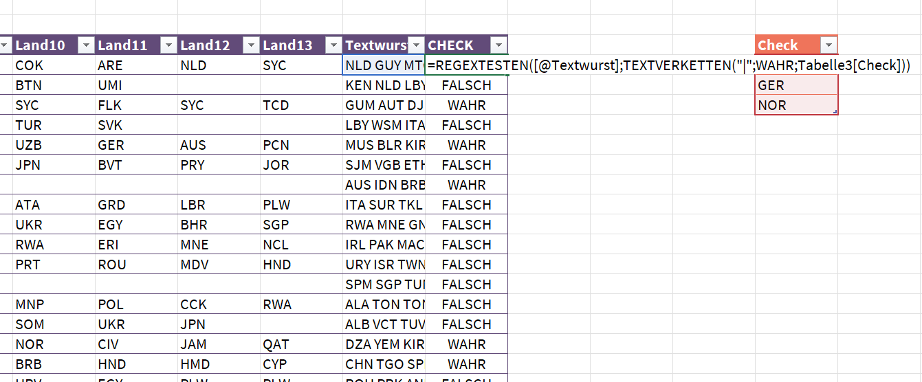 Ich verwende noch ein TEXTVERKETTEN, um meine Auswahlländer mit einem | dazwischen aneinanderzuhängen, prüfe die Textwurst mit der sich daraus ergebenden RegEx AUT|GER|NOR – fertig!