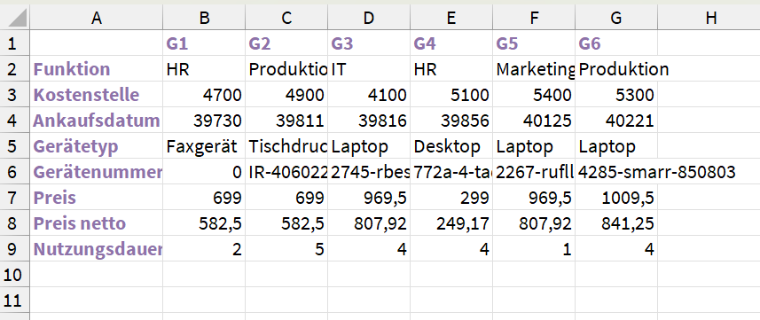Versuchen Sie jetzt einmal, mit einer Pivottabelle die Preise nach Kostenstelle zu summieren – klappt nicht? Korrekt. „Fast alles“ in Excel (und in Datenhaltungen generell) erwartet sich Eigenschaften als Spaltenüberschriften, und dann eine Zeile je Objekt, und damit können diese Tools auch gut umgehen. Mit so etwas hier: nicht.