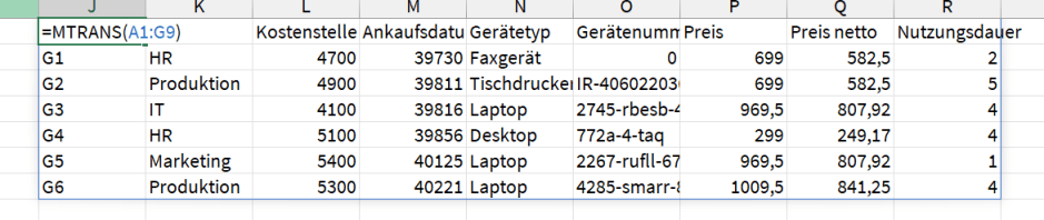 Es gibt eine Funktion, die Zeilen und Spalten tauscht – Fachbegriff: die Matrix transponiert. Daher der Funktionsname MTRANS. Und sehen Sie selbst: