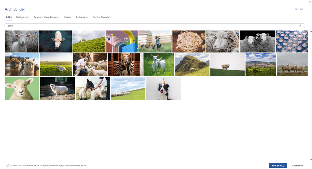 Also: heute zeige ich Ihnen, dass Sie (als Microsoft 365-Abonennt:in) hier auch Bilder finden können, und zwar solche, die Sie ohne nachzudenken oder nachzufragen nutzen dürfen. Es gibt auch hier wieder eine Suchfunktion, ich habe jetzt einmal Schaf eingegeben: