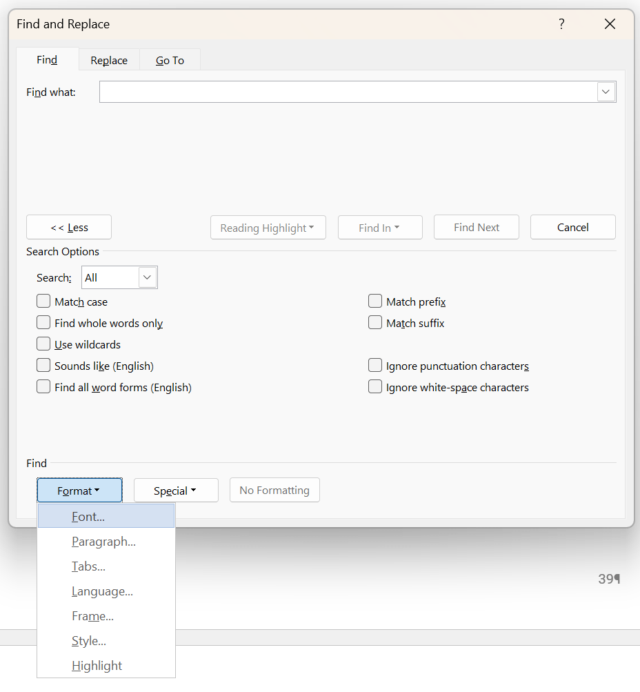 Ich suche umgehend nach weiteren Kuckuckseiern, und zwar so: Her mit dem Suchdialog (zum Beispiel mit Strg+H, und dann Wechsel auf die Registerkarte Suchen – in der englischen Version heißt sie Find). Weitere Optionen ausklappen, falls erforderlich (Button links unten, falls Ihr Dialog viel kleiner ist als untenstehender Screenshot). Format > Fon auswählen.